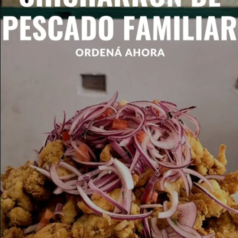 Gran porción de cubos de pescado rebozados y fritos, servidos con salsa criolla de cebolla morada y tomate.