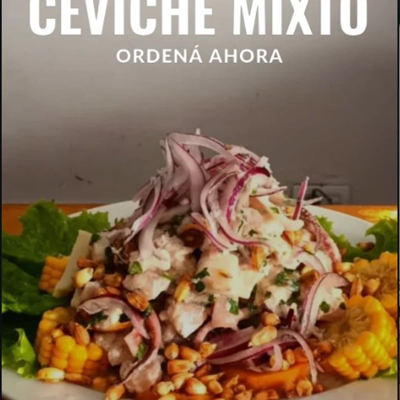 Mix de pescados y mariscos curados en limón con cebolla morada, ají y cilantro. Acompañado de batata cocida, choclo desgranado y maíz cancha.